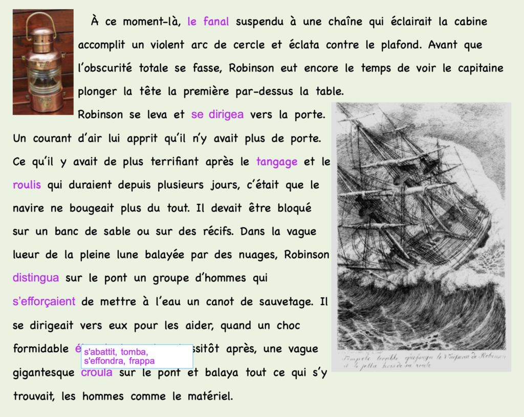 Un exemple du chapitre 1 : les mots en rose sont soit illustrés (en haut à gauche, un fanal), soit définis (j’ai placé la souris sur le dernier mot « croula » dont la définition (des synonymes) apparaît au-dessus : s’abattit, tomba, s’effondra.